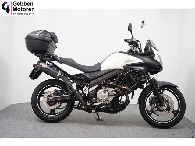 Nette en goed onderhouden Susuki DL 650 V-Strom voorzien van valbeugels met mistlampen, topkoffer met rugkussen, tankpad, LED knipperlichten, middenbok, carterpanbeschermer, opzetruit, standaard verbreder, handkappen en handvatverwarming.
